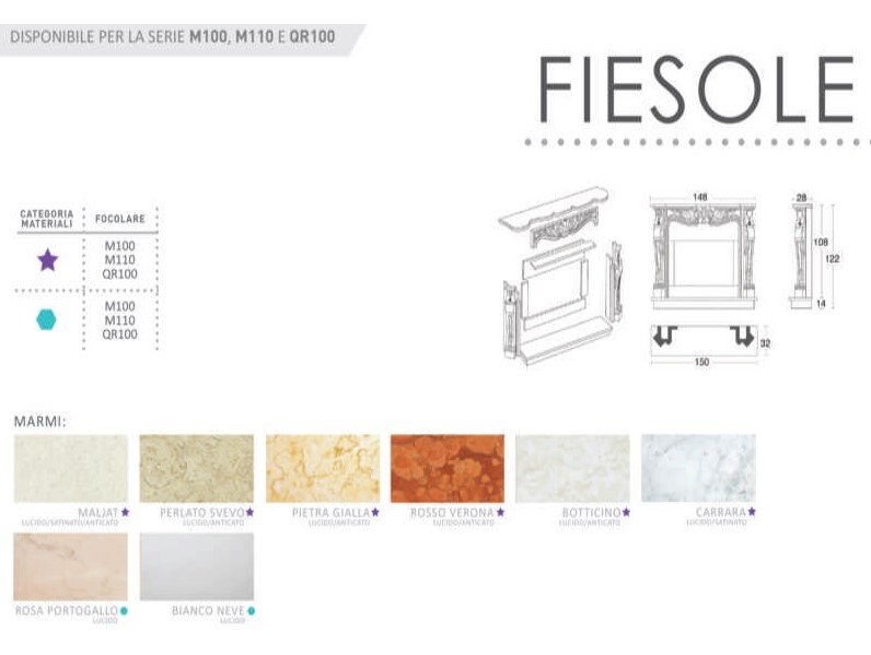 Cornice realizzata in marmo con colore a scelta, abbinabile alla serie M100, M110 E QR100 sia ghisa che refrattario.
