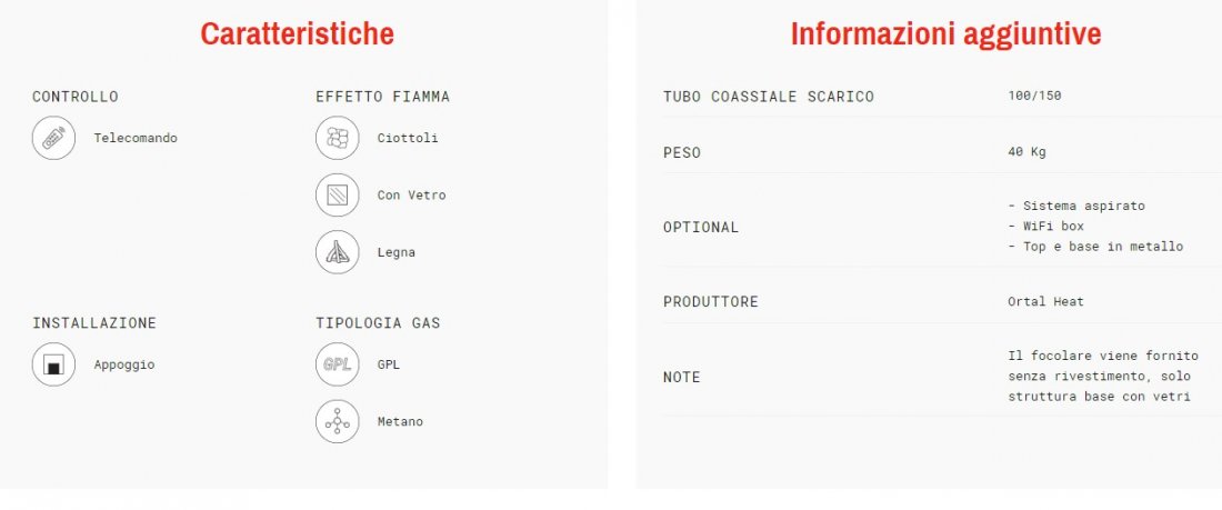 GAS 100 TRIFACCIALE Descrizione Visione panoramica del fuoco, ridotto uso di parti strutturali a vista Sistema Realistic Fire Plus Funzionamento a gas metano o gpl Sistema alimentazione telecomando: 2 batterie AAA Sistema di alimentazione ...