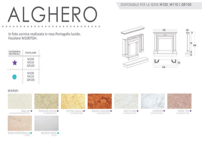 Cornice realizzata in marmo con colore a scelta, abbinabile alla serie M100, M110 E QR100 sia ghisa che refrattario.