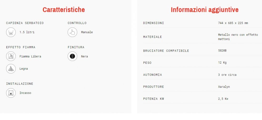Box metallico effetto mattoni da incassare all’interno di un camino oppure di una parete creata ad hoc. La struttura è realizzata in metallo mentre l’effetto mattoni è realizzato con dei pannelli in vermiculite lavorata per bruciatore 5820.