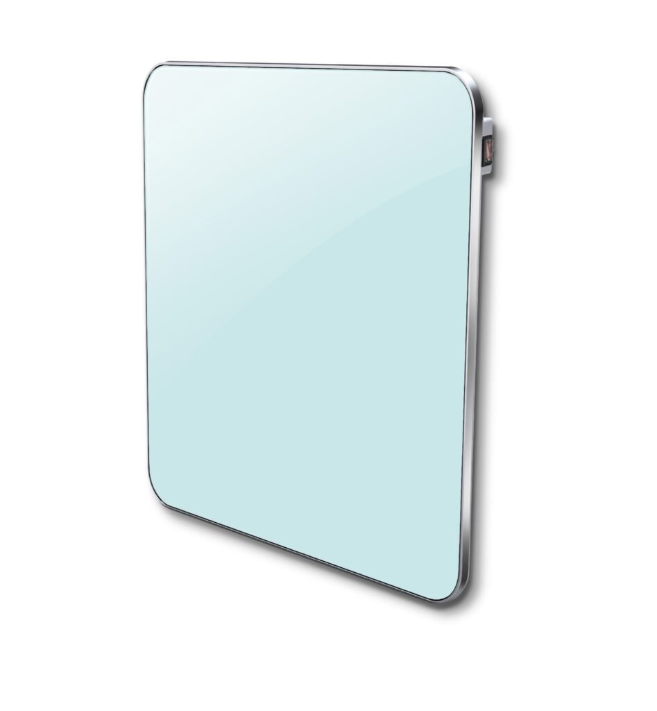 Pannello riscaldante da fissare al muro; elegante finitura in vetro bianco, costruzione robusta con design ultraleggero e sottile. Filo di riscaldamento in silicone.