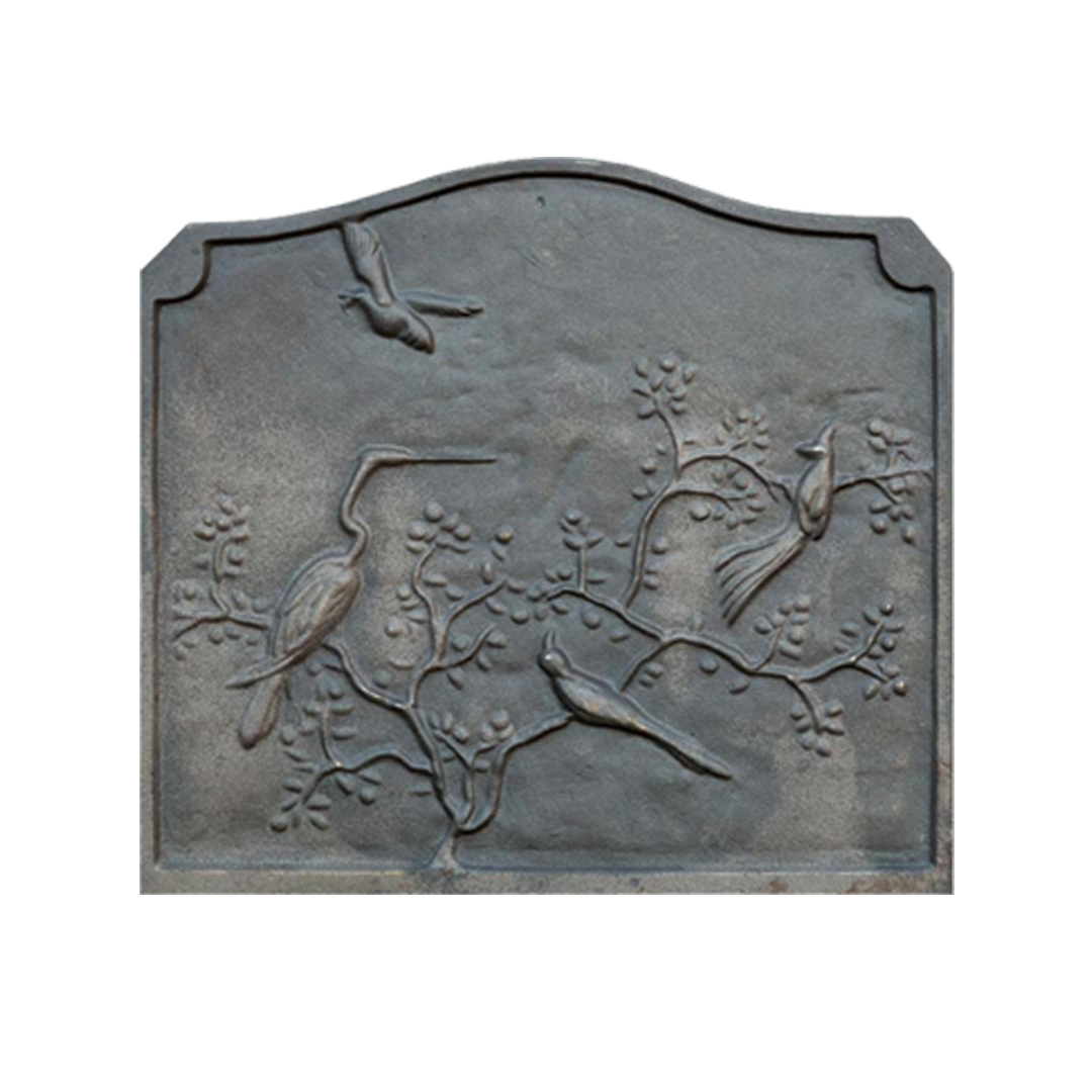 Lastra sagomata, decorata con rami ed uccelli, dimensioni 53x49 cm, spessore 1 cm, peso 16 kg. Le lastre in ghisa, oltre a molti altri usi, sono l'ideale per il ripristino di vecchi caminetti e stufe. Grazie all'ampia gamma di misure, installatori e manutentori, possono soddisfare la maggior parte delle esigenze di restauro o ripristino.