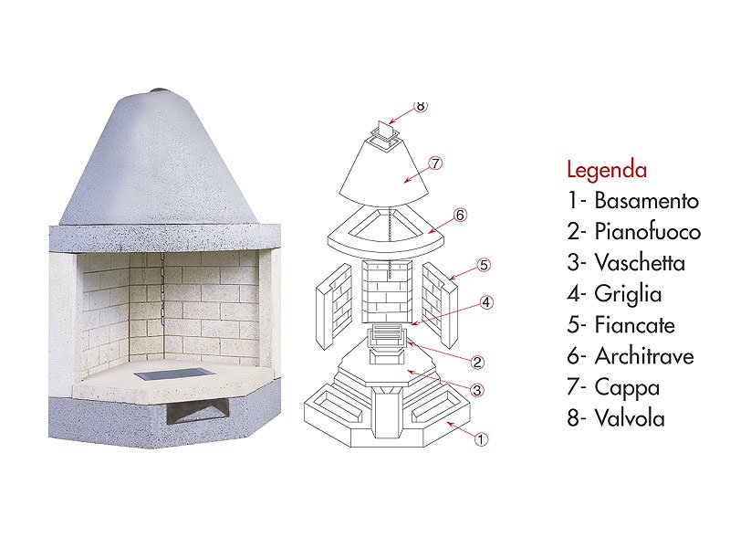 Caminetto prefabbricato a legna a focolare a perto completo di valcola fumi, vaschetta cenere e griglia in ghisa. Struttura realizzata in conglomerato cementizio alleggerito. Focolare realizzato in refrattario ad alto tenore di allumina. Posizionabile ad angolo, ideale per la cottura di cibi ed arrosti.