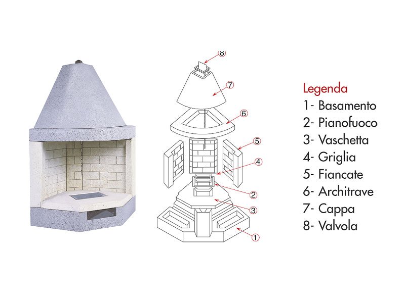 Caminetto prefabbricato a legna a focolare a perto completo di valcola fumi, vaschetta cenere e griglia in ghisa. Struttura realizzata in conglomerato cementizio alleggerito. Focolare realizzato in refrattario ad alto tenore di allumina. Posizionabile ad angolo adatto per essere collocato in ambienti molto stretti, ideale per la cottura di cibi ed arrosti.
