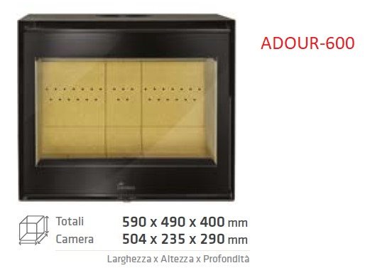 Inserto camino a legna di piccole dimensioni (L. 59 x H.49 x P. 41 cm), ideale sia per inserimento in focolari esistenti sia per nuove installazioni. È dotato di ventilazione frontale, porta in vetro e cassetto portacenere integrato. ...