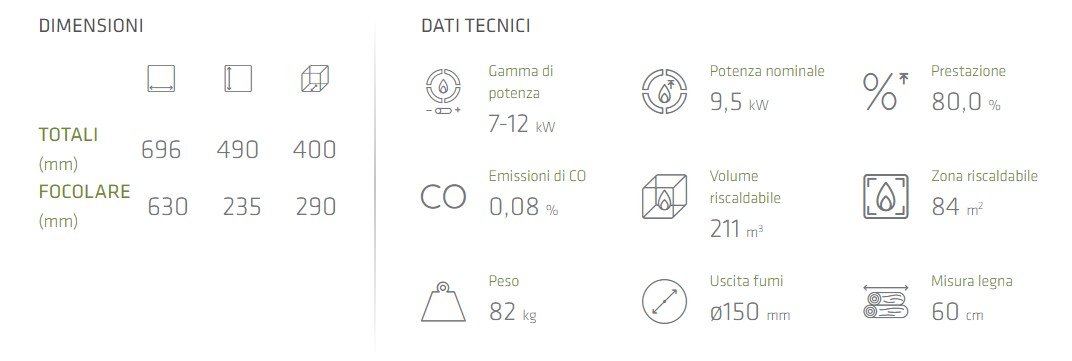 Inserto camino a legna con focolare in Alutec® e anta battente con chiusura automatica soft closing, per facilitare le operazioni di caricamento e pulizia. Grazie ad ingombro e pesi contenuti, questo inserto è particolarmente adatto ...