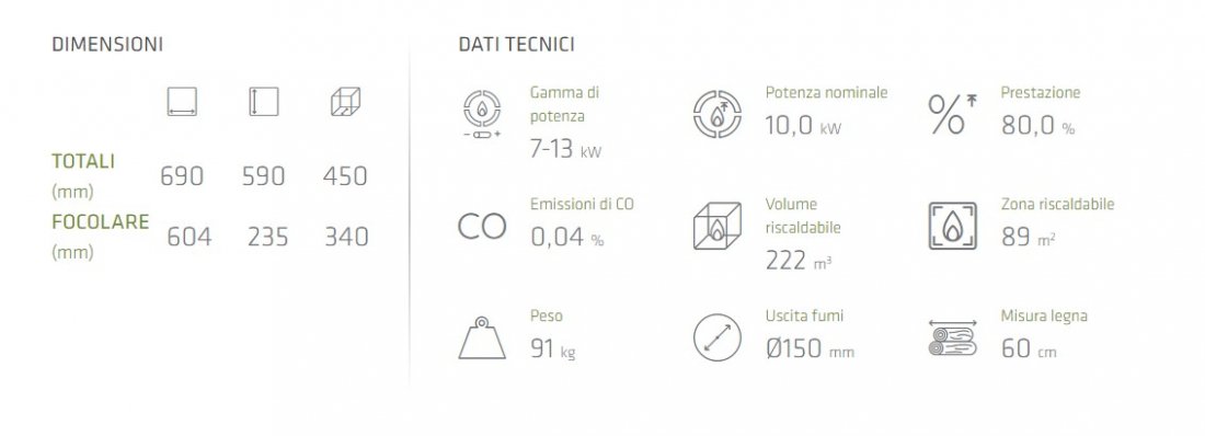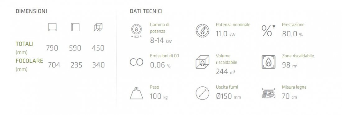 Inserto camino a legna con focolare in Alutec® e anta battente con chiusura automatica soft closing, per facilitare le operazioni di caricamento e pulizia. Grazie ad ingombro e pesi contenuti, questo inserto è particolarmente adatto ...