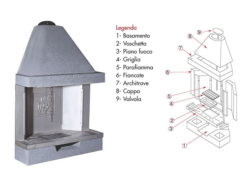 Modello posizionabile sia ad angolo che a parete, apertura in entrambi i lati. Il piano fuoco ed il parafiamma sono interamente in ghisa da 10 mm. di spessore.