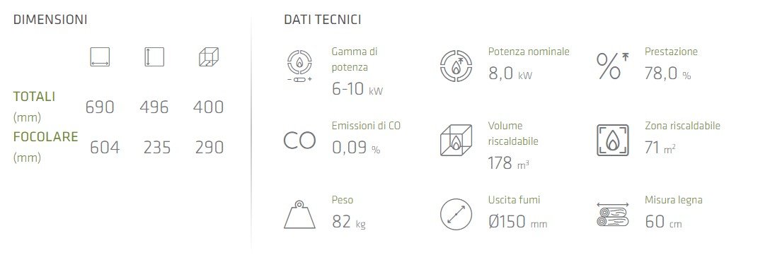 Stufa in acciaio e ghisa. < Interni in vermiculite. < Griglia in ghisa e piano fuoco in vermiculite. < Sistema a doppia combustione. < Cassetto porta legna inferiore. < 3 controlli per la combustione. < Uscita fumi superiore.