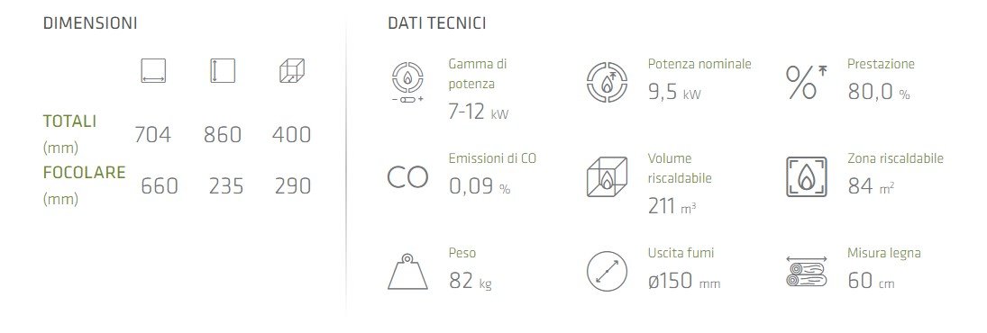 Stufa in acciaio e ghisa. < Interni in vermiculite. < Griglia in ghisa e piano fuoco in vermiculite. < Sistema a doppia combustione. < Cassetto porta legna inferiore. < 3 controlli per la combustione. < Uscita fumi superiore.