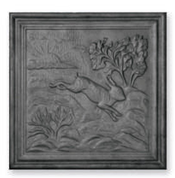 Lastra sagomata, decorata con di un coniglio in fuga, dimensioni 50x50 cm, spessore 1cm, peso 23 kg. Le lastre in ghisa, oltre a molti altri usi, sono l'ideale per il ripristino di vecchi caminetti e stufe. Grazie all'ampia gamma di misure, installatori e manutentori, possono soddisfare la maggior parte delle esigenze di restauro o ripristino.