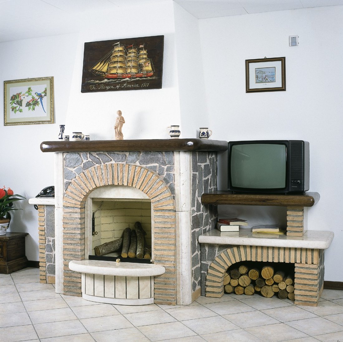 Caminetto con rivestimento realizzato in mezzane anticate, porfido e rosa Verona. Legni asciati tinta color noce. A richiesta può essere realizzato con mosaico di pietra dorata come l’art. 568, con mosaico di travertino rosa come l’art. 529, con bozzette di travertino rosa come l’art. 538 con bozzette sabbiate come l’art. 596.