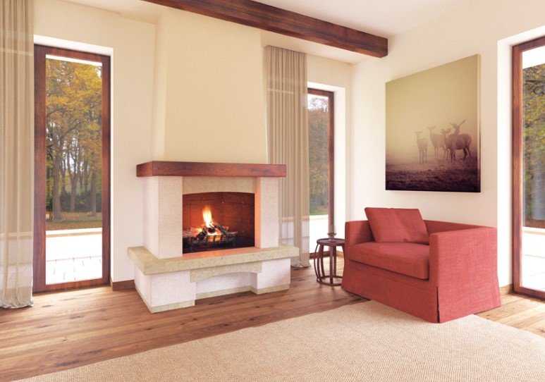 In foto soglia inferiore, zoccolo, archetto ed architrave realizzati in Marmo perlato svevo anticato; Sottogrado e spallette realizzate in Pietra Bianca bocciardata; mensola superiore in legno lamellare spessore 12 cm.