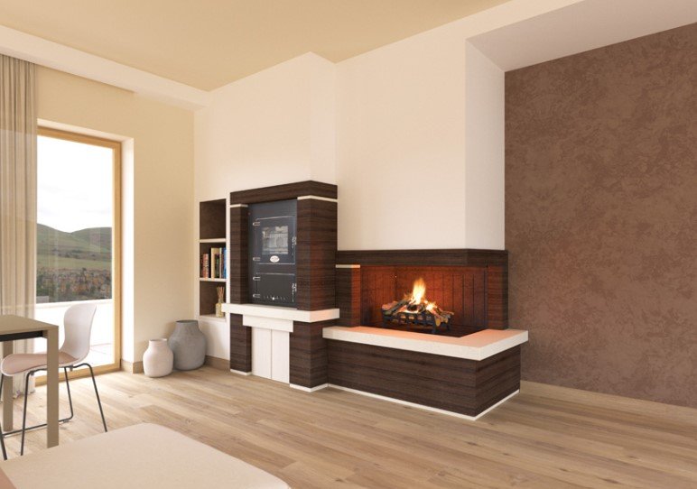 In foto sottogrado, alzate e cornice contorno bocca realizzati in Pietra Naturale Wengè; Soglia inferiore, zoccolo ed inserti realizzati in Marmo Maljat lucido.