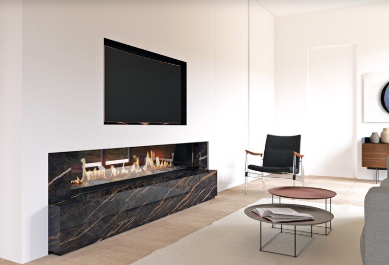 Rivestimento per camino frontale che crea un angolo a 90° (a destra o a sinistra), realizzato in pietra Kanfanaro levigata e acciaio trattato effetto alluminio spazzolato. E' possibile averlo anche con materiali diversi e su misura.