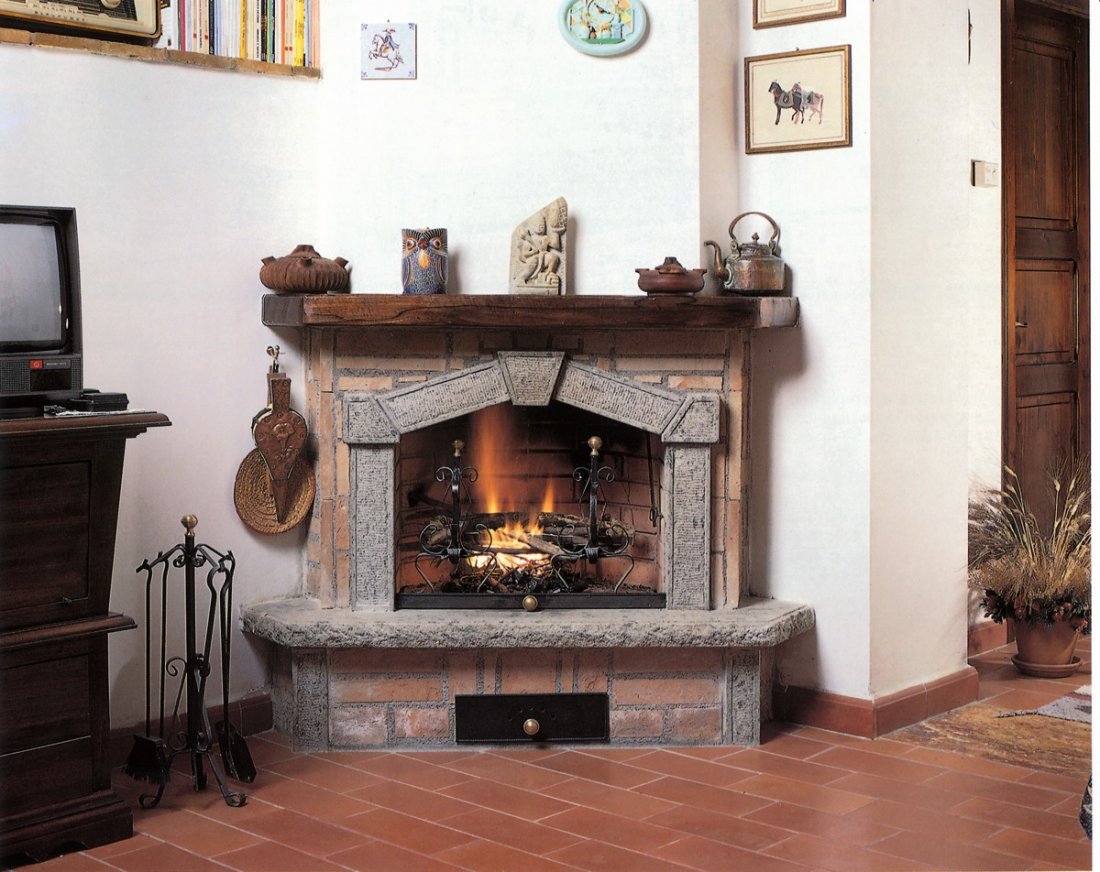 Caminetto con rivestimento realizzato con mattoni mezzane anticate fatte a mano.