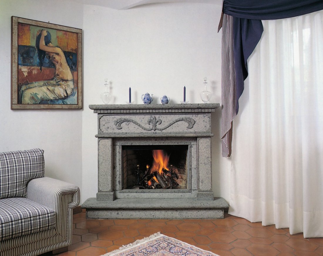 Caminetto con rivestimento realizzato in massetto di trani bocciardato, mensola piano fuoco rialzata ed architrave in trani lucido; rifiniture montanti, sotto mensola piano fuoco e mensola superiore in rosso marocco liscio. A richiesta può ...