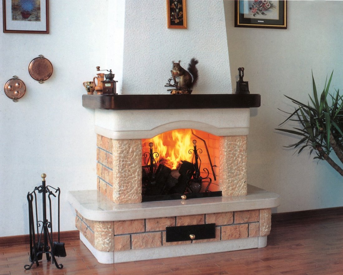 La versione moderna si ha sostituendo le parti in travertino rosato con massetti di trani bocciardato e le mensole piano fuoco con quelle in rosso verona o granito (nero, giallo veneziano, rosso multicolor); inoltre a richiesta si può avere cassapanca porta legna a destra o a sinistra e porta TV, a richiesta su misura.