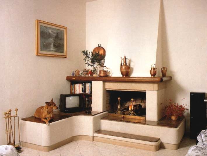 Caminetto con rivestimento realizzato in massetto di trani bocciardato con battiscopa ed architrave in trani liscio; mensole piano fuoco in granito rosso multicolor; trave, cassapanca e libreria in legno massello tinta color noce. Può essere fornito anche su misura. Inoltre a richiesta, si può sostituire il granito del piano fuoco con altri marmi, pietre o graniti diversi.
