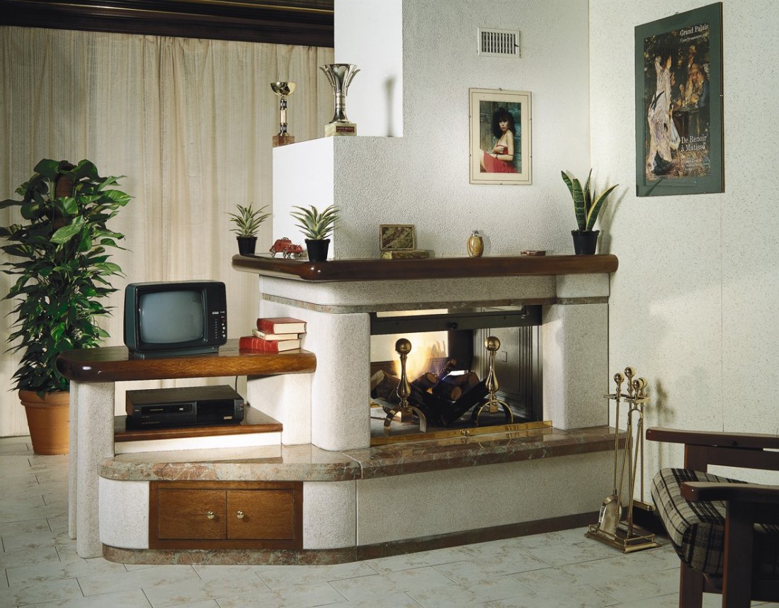 Caminetto con rivestimento realizzato in massetto di trani bocciardato; rifiniture e mensole piano fuoco in rosso marocco. Porta TV, porta videoregistratore e trave in legno massello tinta color noce.