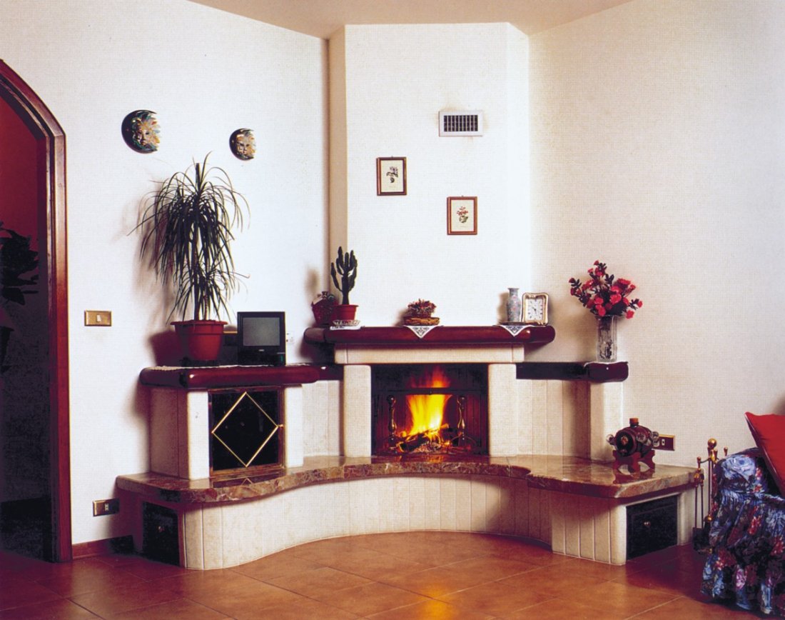 Caminetto con rivestimento realizzato in bozzette e massetti di trani bocciardato; mensole piano fuoco in rosso marocco; sportello bar in ottone trattato bagno oro; sportelli porta legna, mensola porta TV, mensola spagliera e trave in legno massello tinta color noce. Il piano fuoco può essere sostituito con marmi e graniti diversi.
