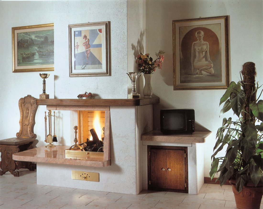Caminetto con rivestimento realizzato in massetto di travertino rosa in parte bugnato ed in parte lucidato con mensole piano fuoco in rosso verona; rifiniture in trani bocciardato; trave e mensola porta televisore in legno massello tinta color ...