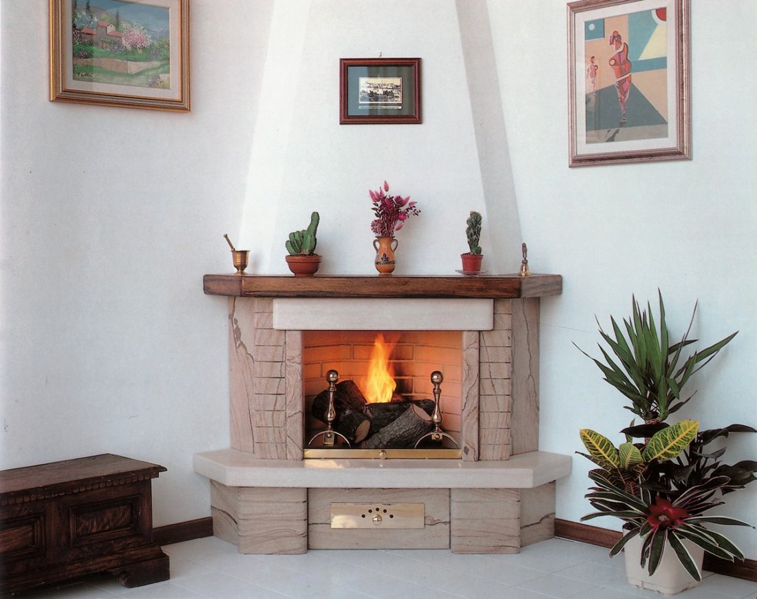Caminetto con rivestimento realizzato in massetto di pietra dorata lucida con architrave, mensola piano – fuoco in trani lucido e trave legno massello tinta color noce; a richiesta può essere fornito pure in pietra dorata o trani bocciardato, con lastre piano fuoco in Rosso Verona, Rosso Marocco ed alltri materiali.