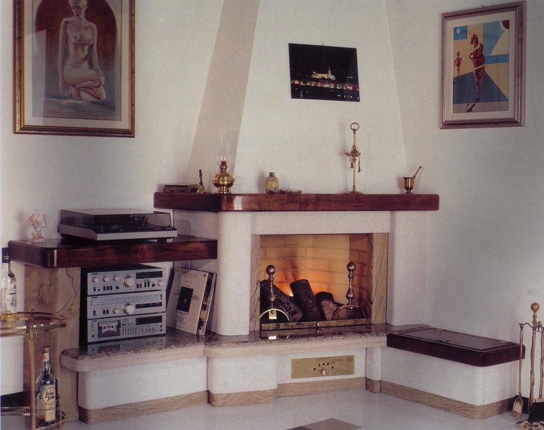 Caminetto con rivestimento realizzato in massetto di trani bocciardato, con colonnina che sostiene il portatelevisore, montanti frontali e battiscopa in pietra dorata lucidata; mensole piano fuoco in granito giallo veneziano oppure a richiesta in granito nero, rosso multicolor ed altri materiali. Trave, ripiano portatelevisore e cassapanca in legno massello tinta color noce.