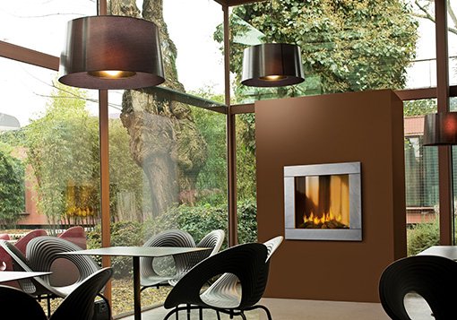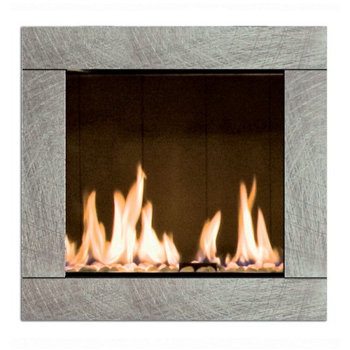 Rivestimento per camino a gas frontale costituito da una cornice in acciaio inox spazzolato irregolarmente oppure in acciaio verniciato con effetto ruggine spazzolato.