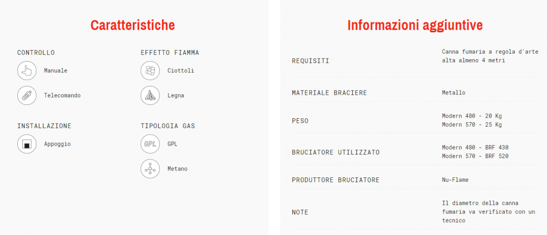 Questo braciere va semplicemente poggiato all’interno del camino, collegato al gas ed è subito funzionante. Il controllo può avvenire sia manualmente tramite una manopola che con il telecomando. Il braciere modern è disponibile in due dimensioni: 480 e 570 ed al suo interno monta rispettivamente un bruciatore BRF 430 e BRF 520. L’effetto fiamma è disponibile sia con ciottoli di fiume che con legna in fibraceramica.