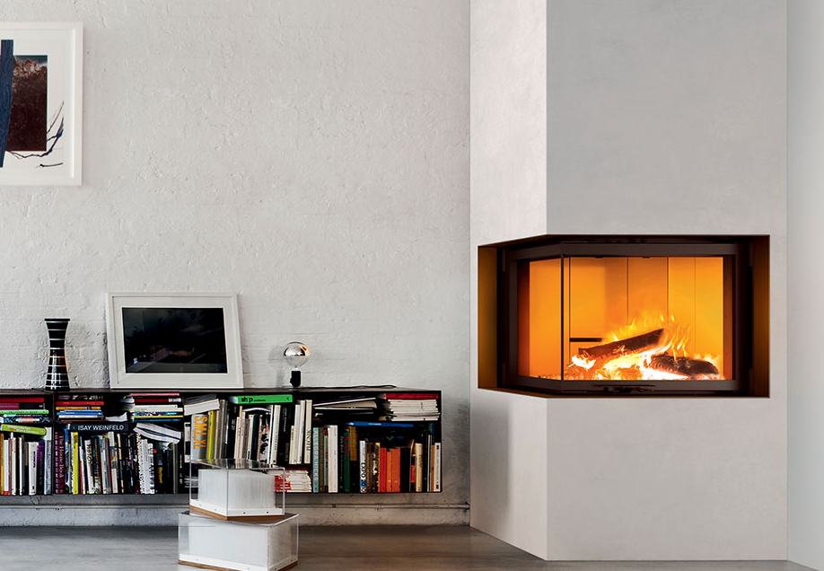 Camino angolare a legna dalle caratteristiche innovative, performante, facile da usare, con camera di combustione stagna.