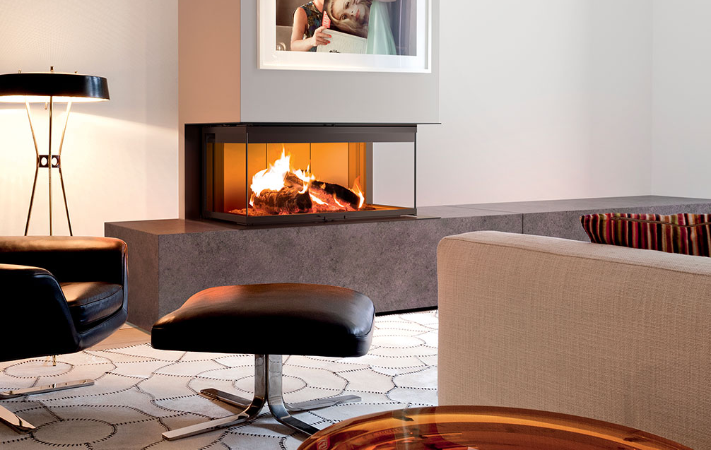Camino trifacciale a legna dalle caratteristiche innovative, performante, facile da usare, con camera di combustione stagna.