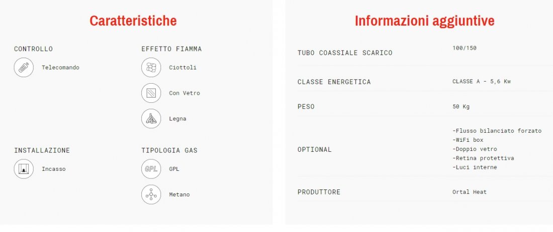 GAS 100 FRONTALE Descrizione Visione panoramica del fuoco, ridotto uso di parti strutturali a vista Sistema Realistic Fire Plus Funzionamento a gas metano o gpl Sistema alimentazione telecomando: 2 batterie AAA Sistema di alimentazione ...