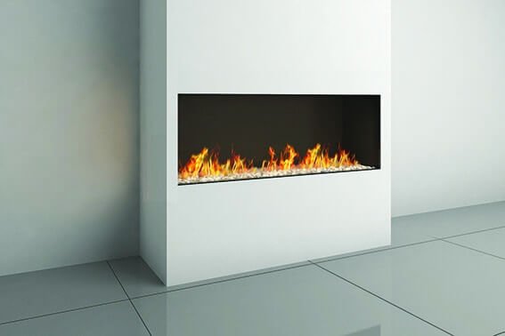 Composti da un solo vetro frontale e senza alcun tipo di cornice garantiscono una visione pulita del fuoco. Controllo con telecomando ed effetto fiamma a scelta tra legna o ciottoli.
