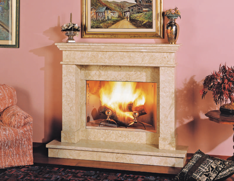 In foto cornice realizzata in perlato svevo lucido. Focolare M100 ghisa.