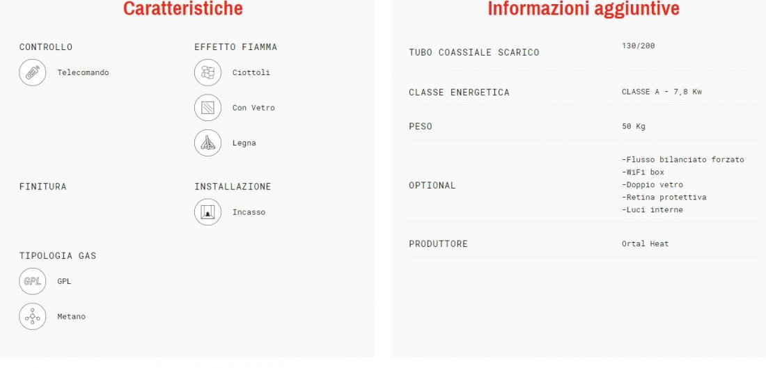 GAS 100 FRONTALE Descrizione Visione panoramica del fuoco, ridotto uso di parti strutturali a vista Sistema Realistic Fire Plus Funzionamento a gas metano o gpl Sistema alimentazione telecomando: 2 batterie AAA Sistema di alimentazione ...