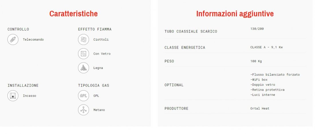 GAS 100 FRONTALE Descrizione Visione panoramica del fuoco, ridotto uso di parti strutturali a vista Sistema Realistic Fire Plus Funzionamento a gas metano o gpl Sistema alimentazione telecomando: 2 batterie AAA Sistema di alimentazione ...