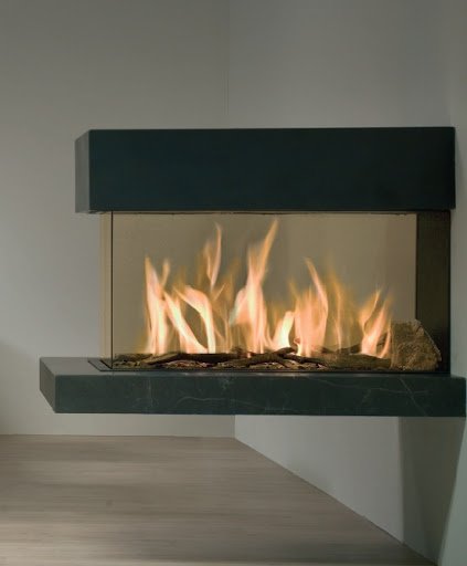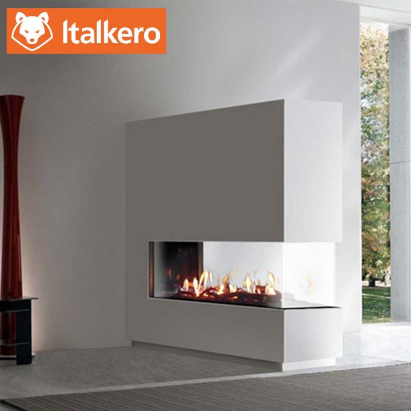 I camini della serie Penisola, con due lati a vetro lunghi ed uno corto, come una vera e propria lingua di fuoco separano ed uniscono allo stesso tempo il vostro living.