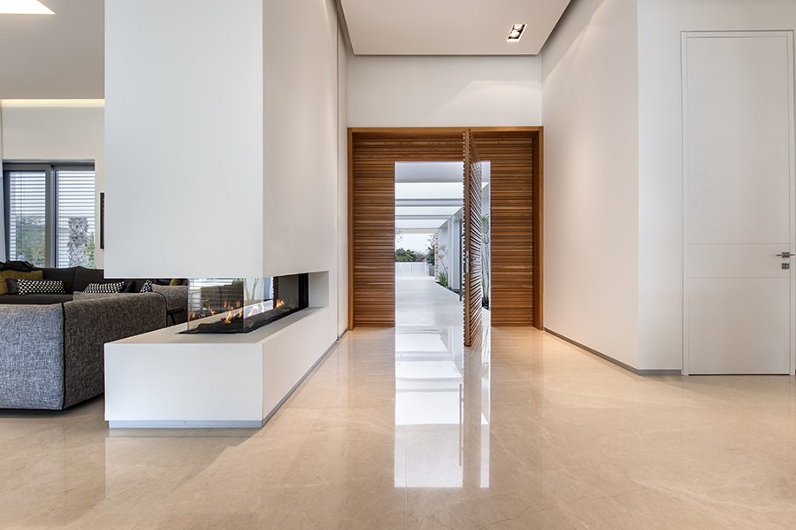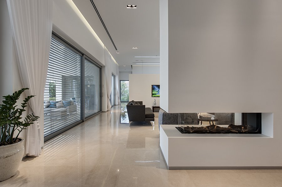 I camini della serie Penisola, con due lati a vetro lunghi ed uno corto, come una vera e propria lingua di fuoco separano ed uniscono allo stesso tempo il vostro living.