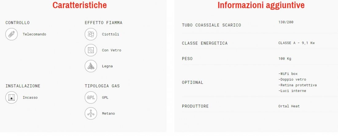GAS 100 LATERALE SX Descrizione Visione panoramica del fuoco, ridotto uso di parti strutturali a vista Sistema Realistic Fire Plus Funzionamento a gas metano o gpl Sistema alimentazione telecomando: 2 batterie AAA Sistema di alimentazione ...