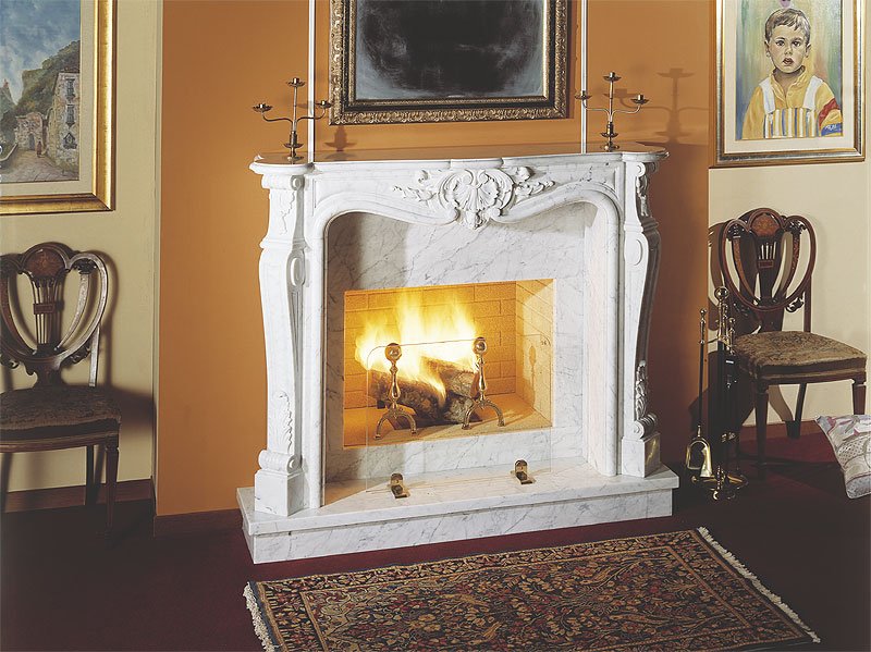 In foto cornice in marmo di Carrara lucido. Focolare QR100 refrattario.