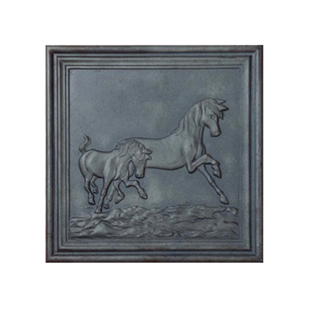 Lastra decorata con cavalli, dimensioni 50x50 cm, spessore 1 cm, peso 22,5 kg. Le lastre in ghisa, oltre a molti altri usi, sono l'ideale per il ripristino di vecchi caminetti e stufe. Grazie all'ampia gamma di misure, installatori e manutentori, possono soddisfare la maggior parte delle esigenze di restauro o ripristino.
