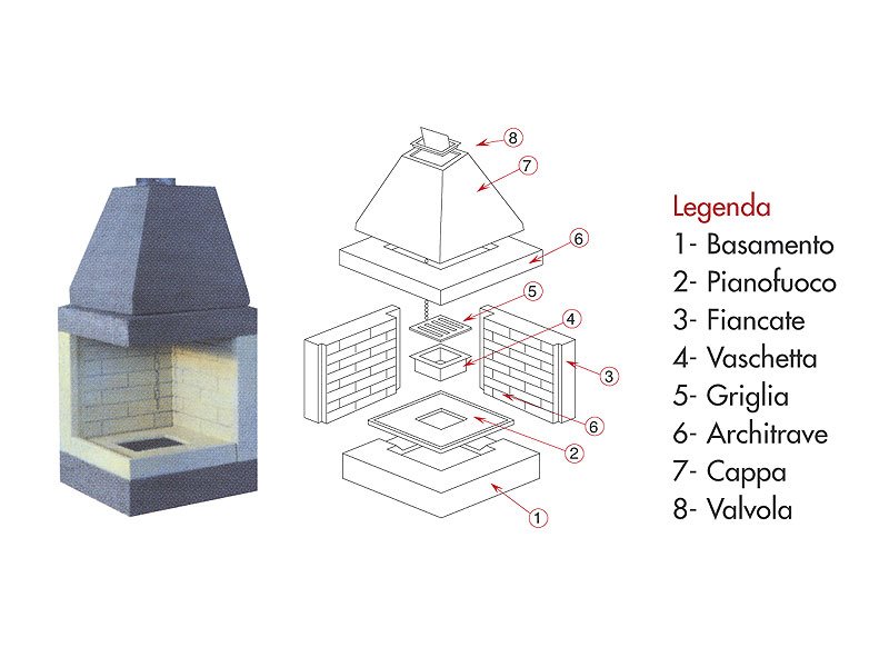 Caminetto prefrabbricato a focolare aperto completo di valvola fumi, vaschetta cenere e griglia in ghisa, struttura in conglomerato cementizio alleggerito. Focolare interamente in refrattario ad alto tenore di alluminia. Ideale per la cottura di cibi e arrosti.