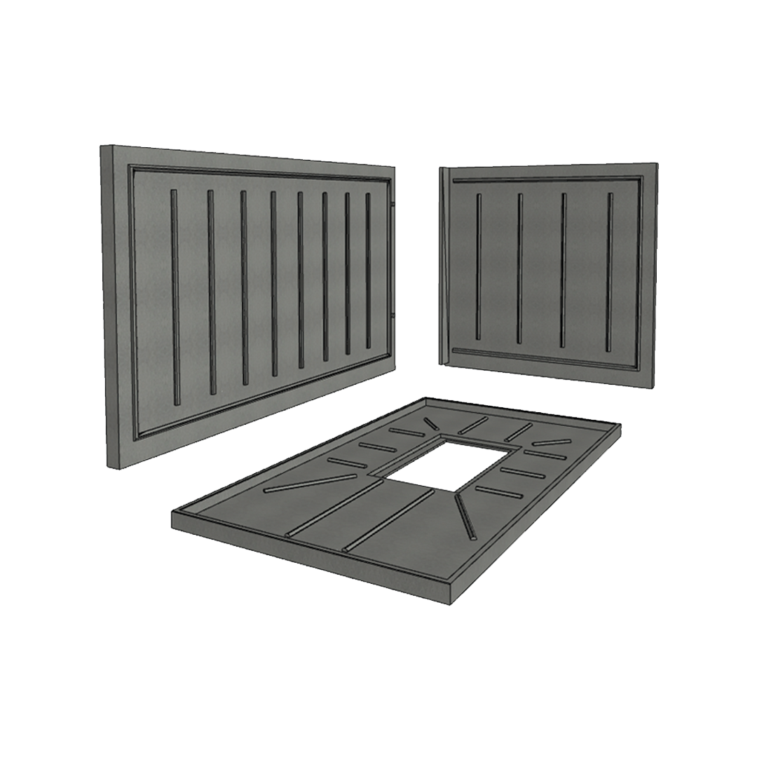 Set di ricambio per focolare DS100 TGH. Disponibile anche l'acquisto dei singoli pezzi: piano fuoco, laterali, vaschetta e griglia.