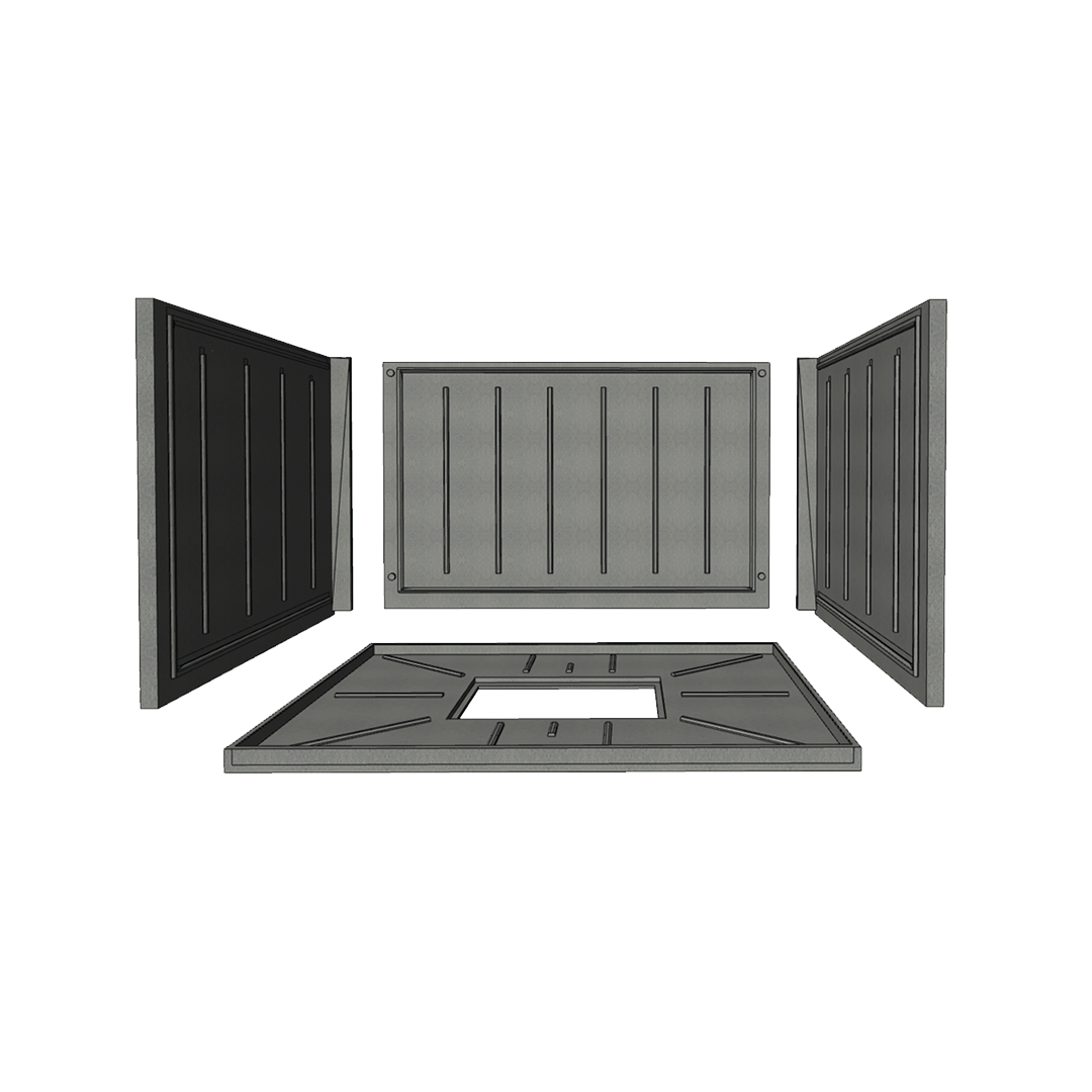 Set di ricambio per focolare QR 100 TGH. Disponibile anche l'acquisto dei singoli pezzi: piano fuoco, fondale, laterali, vaschetta e griglia.