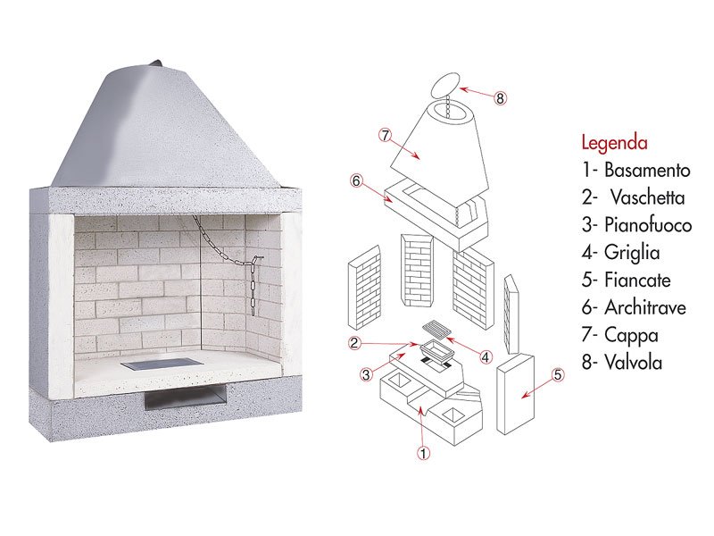 Caminetto prefabbricato a legna a focolare aperto completo di parafiamma in ghida da 16kg, valvola fumi, vaschetta cenere e griglia in ghisa. Struttura realizzata in conglomerato cementizio alleggerito. Focolare realizzato in refrattario ad alto tenore di allumina. Posizionabile sia ad angolo che a parete ideale per la cottura di cibi ed arrosti.
