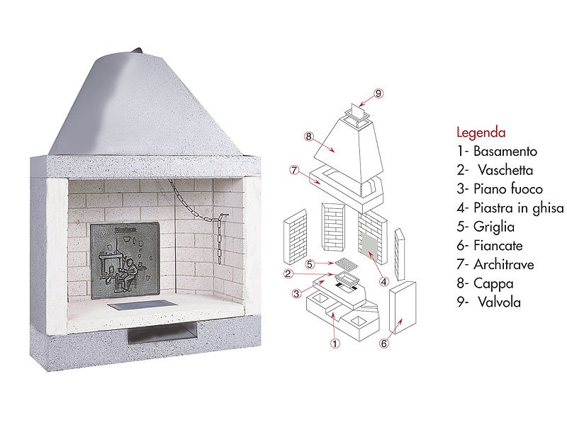 FOCOLARE M140 REFRATTARIO Caminetto prefabbricato a legna a focolare aperto completo di parafiamma in ghida da 16kg, valvola fumi, vaschetta cenere e griglia in ghisa. Struttura realizzata in conglomerato cementizio alleggerito. Focolare realizzato in refrattario ad alto tenore di allumina. Posizionabile sia ad angolo che a parete ideale per la cottura di cibi ed arrosti. CANNA FUMARIA Altezza: m 3-5 Sezione: 350 mm di Diametro |