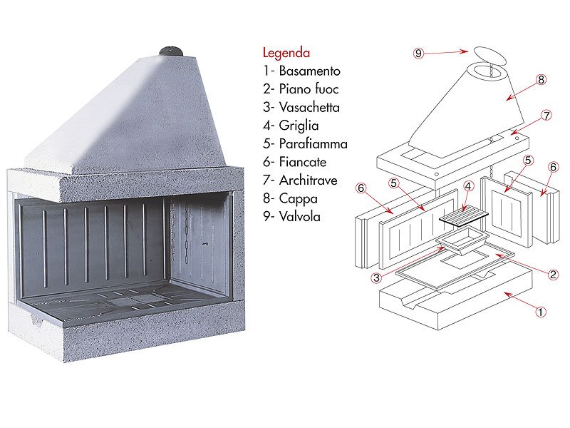 Caminetto in argilla espansa con laterale aperto. Il piano fuoco, la griglia e le pareti laterali sono interamente in ghisa ed hanno un peso complessivo di 80 KG. Lo stesso camino può essere sistemato indifferentemente con l'apertura a DX o a SX. Il modello DX-SX 100 TGH ha un alto rendimento termico e grazie all'ampiezza del piano fuoco si presta benissimo anche alla cottura di cibi.