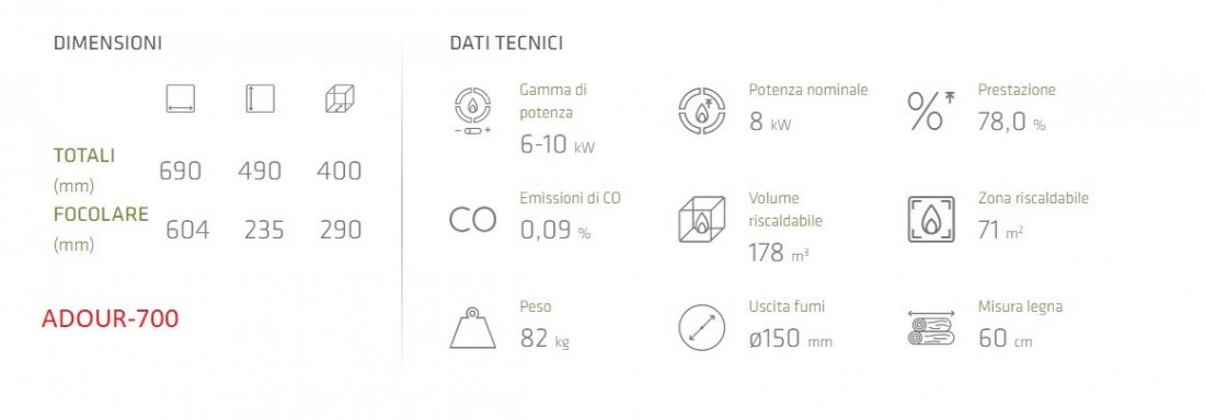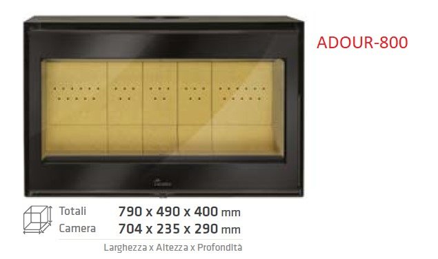 < Inserto ventilato e canalizzabile. < Interni in vermiculite. < Il modello Baltic 800 è dotato di turbina da 125 m3/h con potenziometro. < Altezza di installazione 63 cm. < Funzionamento su letto di brace (no cassetto ...
