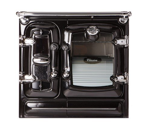 < Cucina realizzata in ghisa smaltata nera, internamente ed esternamente.